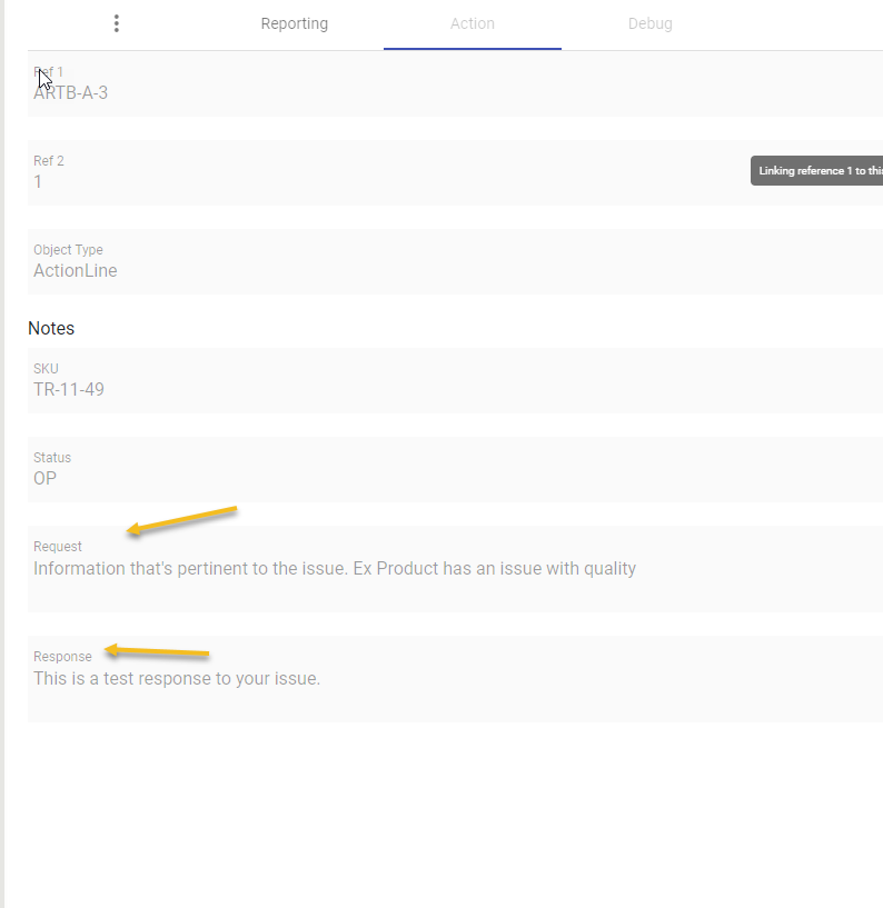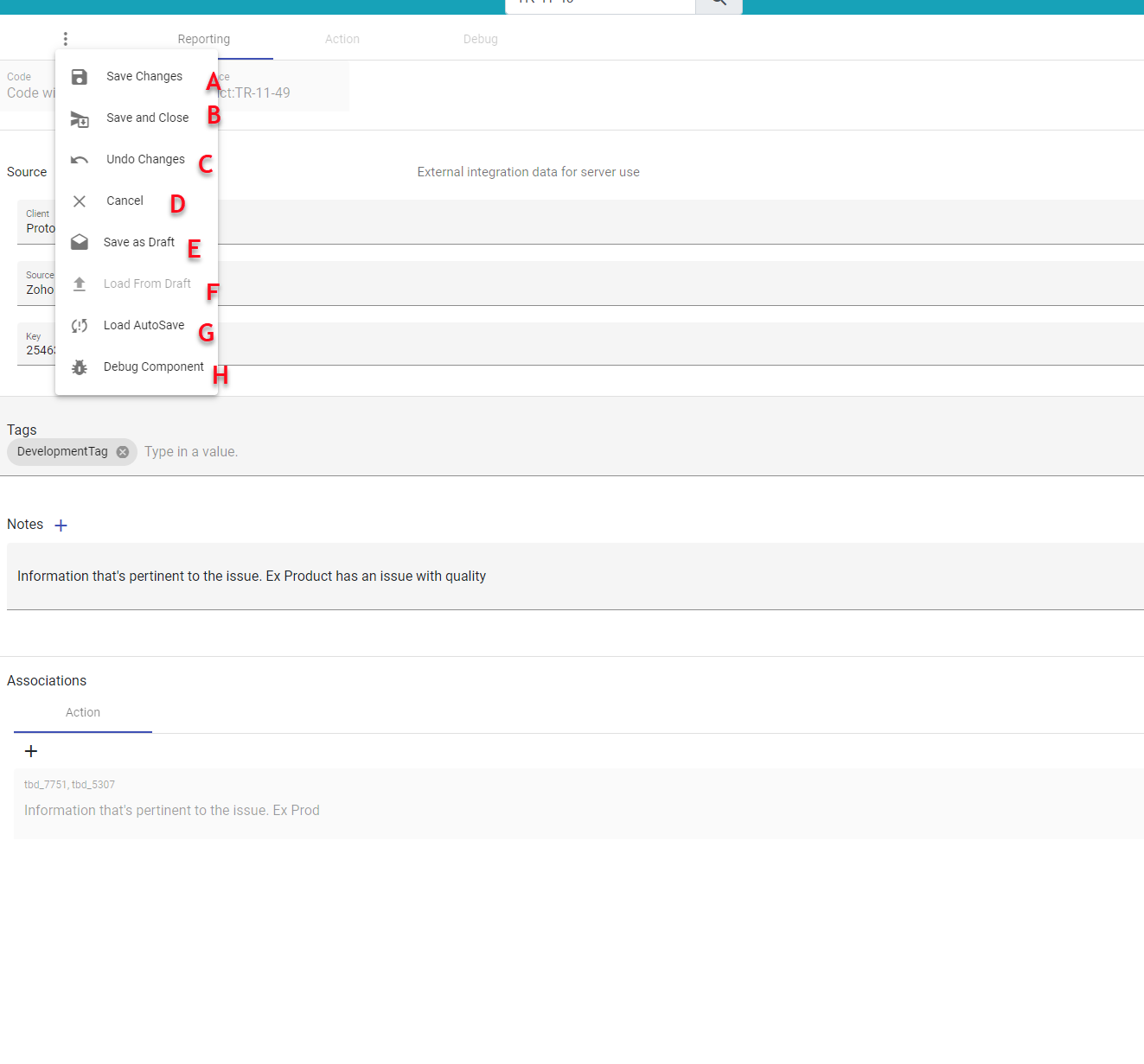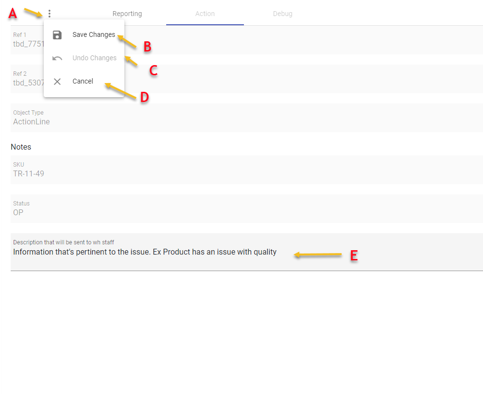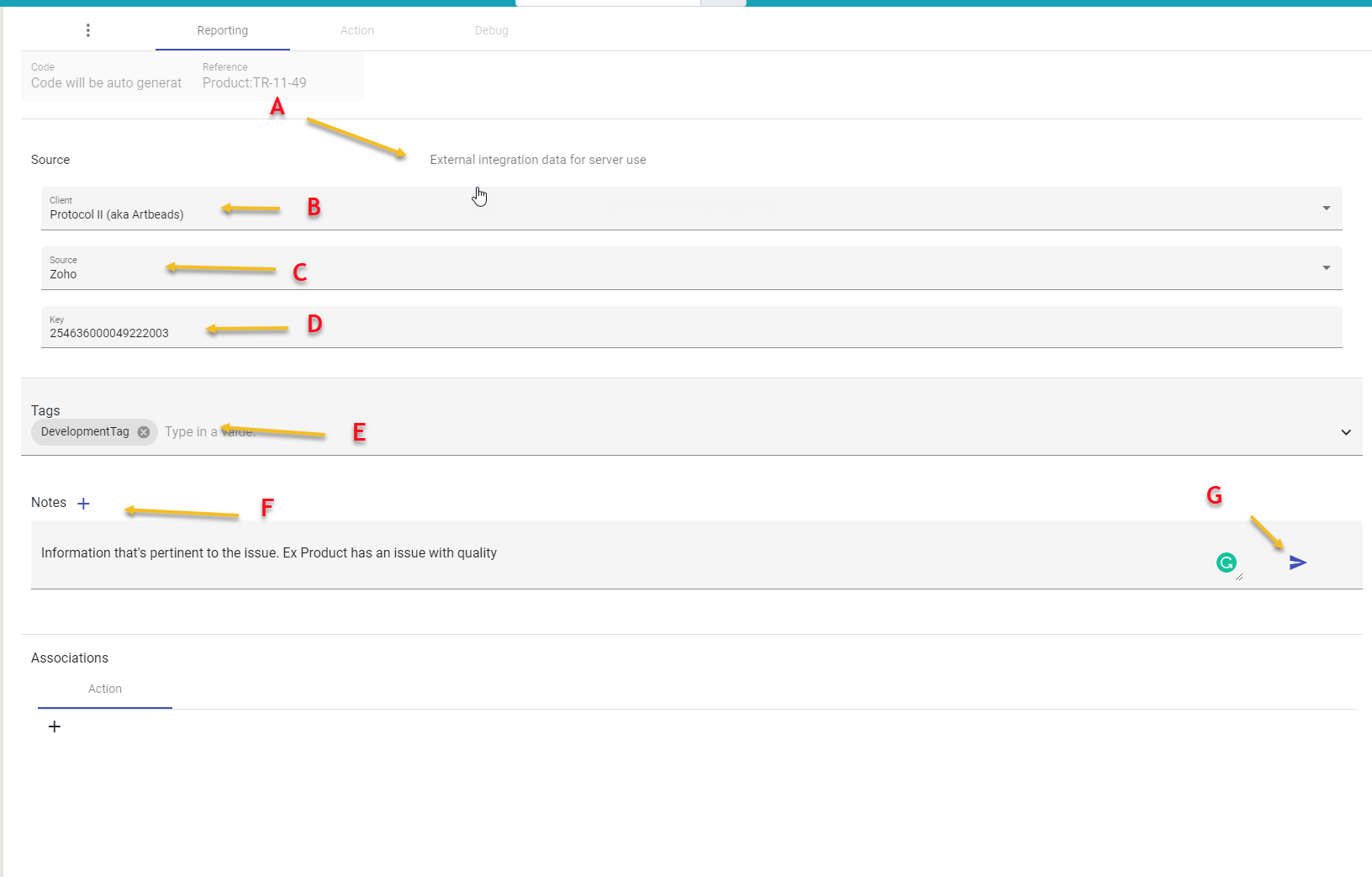 G: Send notes button: this button sends you to the Action Editor, where you can specify more information if you would like